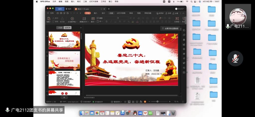 各参赛团支书依次通过腾讯会议屏幕共享的形式,围绕“喜迎党的二十大”这一主线深入进行团史、党史学习教育宣讲。本次线上比赛为团支书们提供了展现自我、积极交流、提升工作能力的平台,进一步彰显了九游娱乐