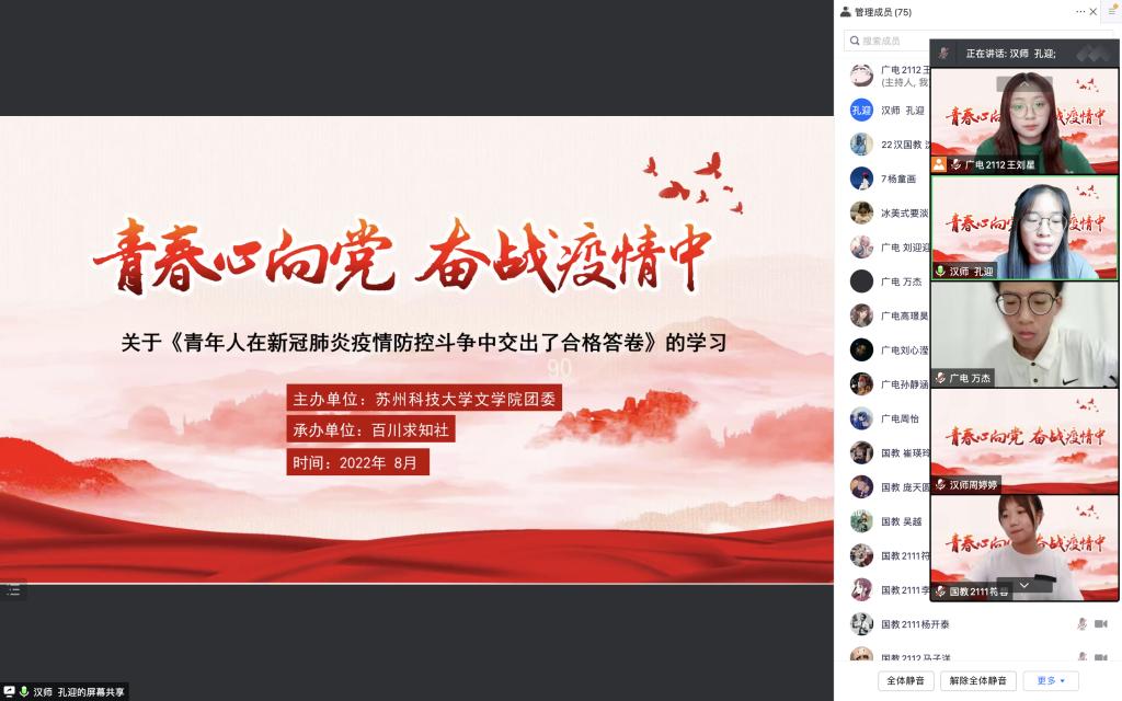 团委对青年的要求,更好团结、组织、动员广大青年为实现第二个百年奋斗目标,我校百川求知社于8月17日组织了本次“青春心向党,奋战疫情中”——关于《青年人在新冠肺炎疫情防控斗争中交出了合格答卷》专题学习活动。