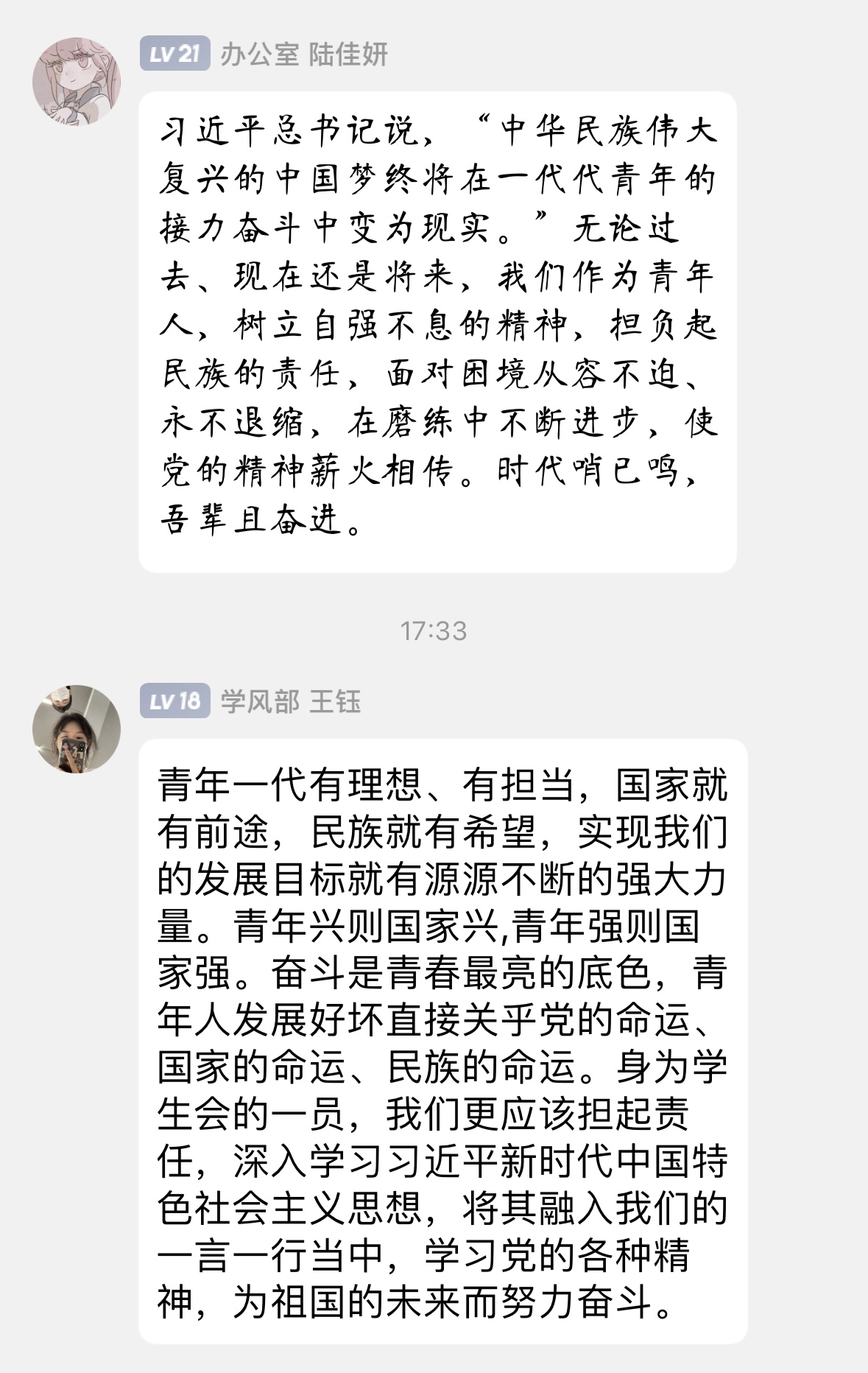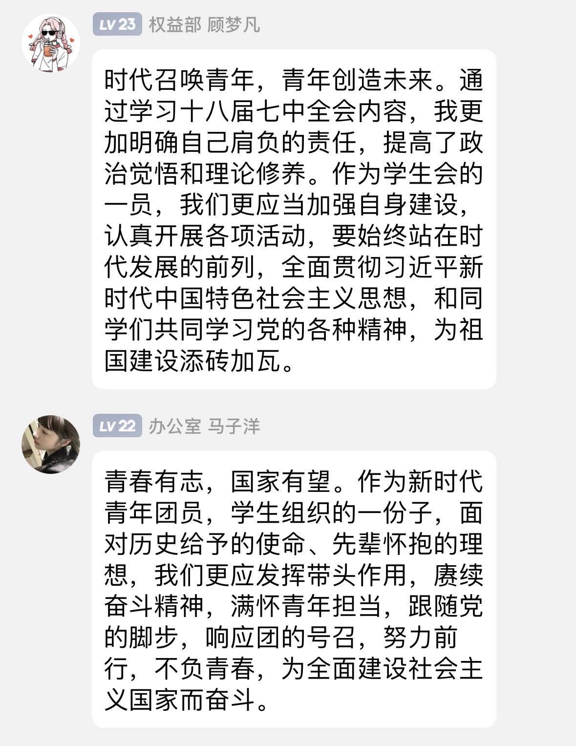 活动中,学生会成员轮流发表学习心得,纷纷表示将努力践行会议精神并落实到日常学生工作中,立足服务本职,提升履职能力,发挥好学生会成员的先锋模范作用,带领同学们肩负起国家与民族的重任,矢志为全面建设社会主义现代化国家而团结奋斗!