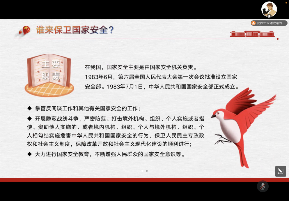 第一部分为常识普及部分,通过演示文稿的方式,对国家安全知识进行了系统的普及。从国家安全基本内容、设立教育日的现实意义、人人都是国家安全的主角三方面向大家详细的讲解了国家安全教育日的有关知识,让参会同学对国家安全知识有了更明确的认知。