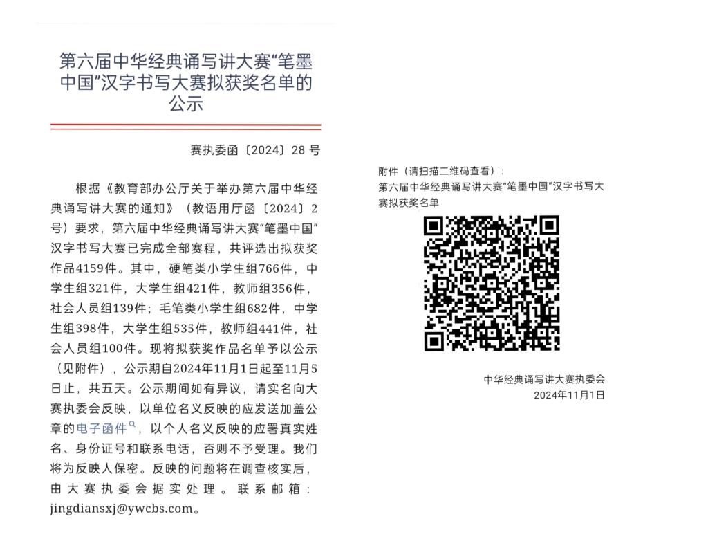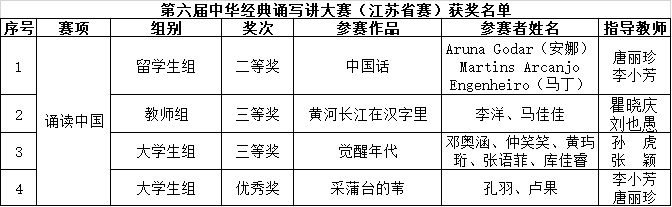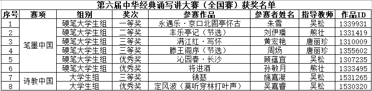 近日,由教育部、国家语委组织的第六届中华经典诵写讲大赛完成了全部赛程,并公布了获奖结果。我校师生在“笔墨中国”汉字书写大赛中获得一等奖1项、二等奖1项、三等奖2项、优秀奖2项;在“诗教中国”诗词讲解大赛中获得三等奖1项、优秀奖1项;在“诵读中国”经典诵读大赛中获得省赛二等奖1项、三等奖2项、优秀奖1项。其中,“笔墨中国”和“诗教中国”两个赛项刷新了近年来我校参加此项竞赛的最佳成绩。具体获奖名单如下:
