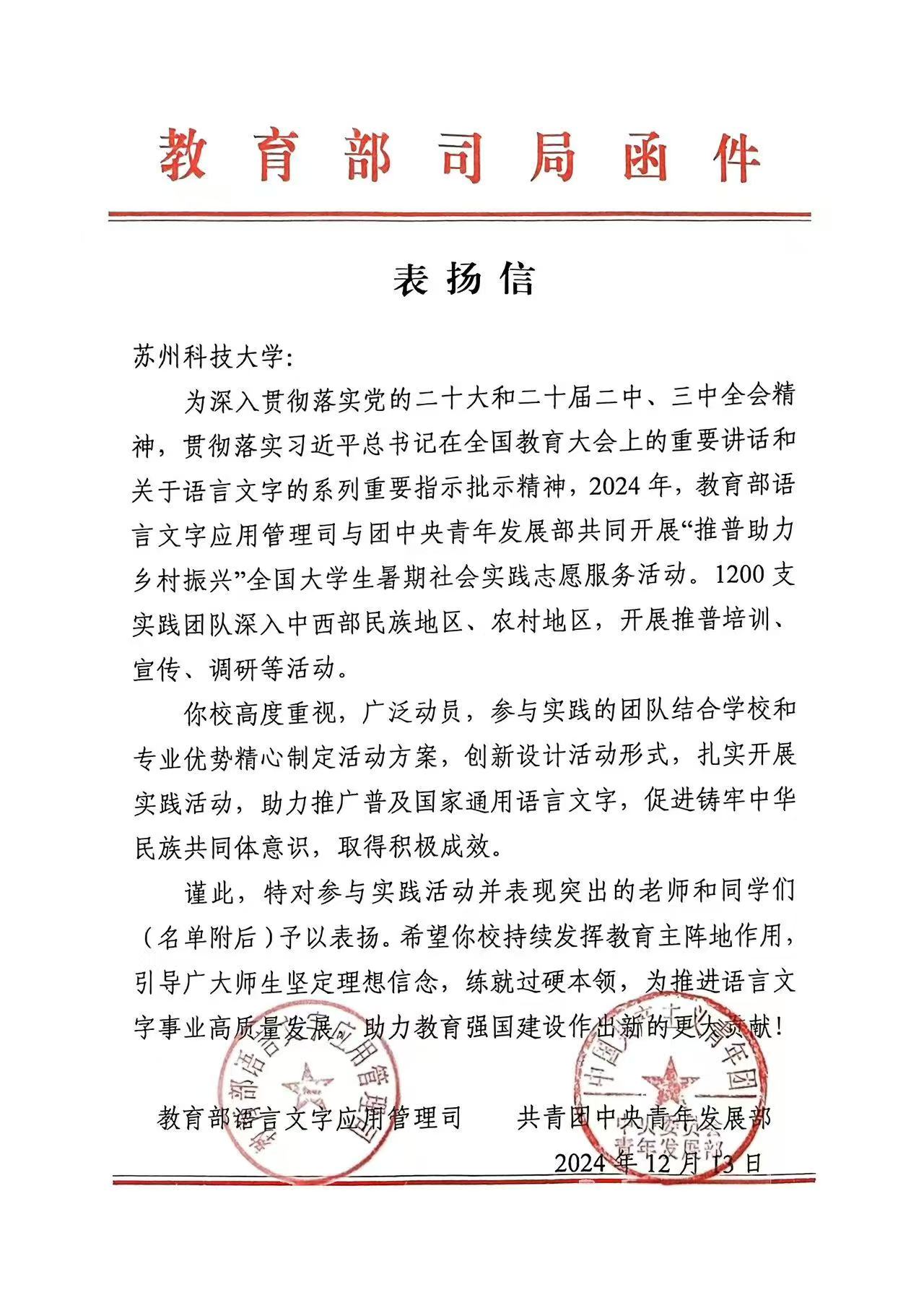 近日,由教育部语言文字应用管理司、共青团中央青年发展部联合开展的2024年“推普助力乡村振兴”全国大学生暑期社会实践志愿服务活动评选结果揭晓,我校组织赴贵州锦屏县的“普润乡音”实践团从全国1200支团队中脱颖而出,获评优秀团队。教育部语言文字应用管理司和共青团中央青年发展部来信表扬,充分肯定了我校在“推普助力乡村振兴”志愿服务活动中的突出表现和取得的积极成效。