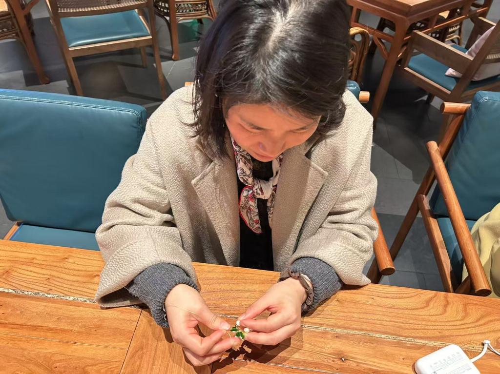 活动最后一项是胸针制作。教职工们每人领取一盒胸针制作材料。随后由专业的老师讲授胸针制作的方法。为了让各位教职工们清楚地看到制作技巧,授课老师近距离、手把手教学。随后教职工们从生疏到熟练,从单一的技巧,到熟练掌握缠绕丝线技法,形成了轻松、愉悦的教与学的氛围。