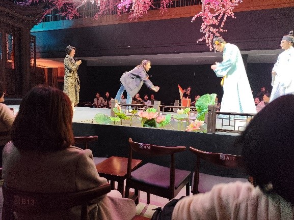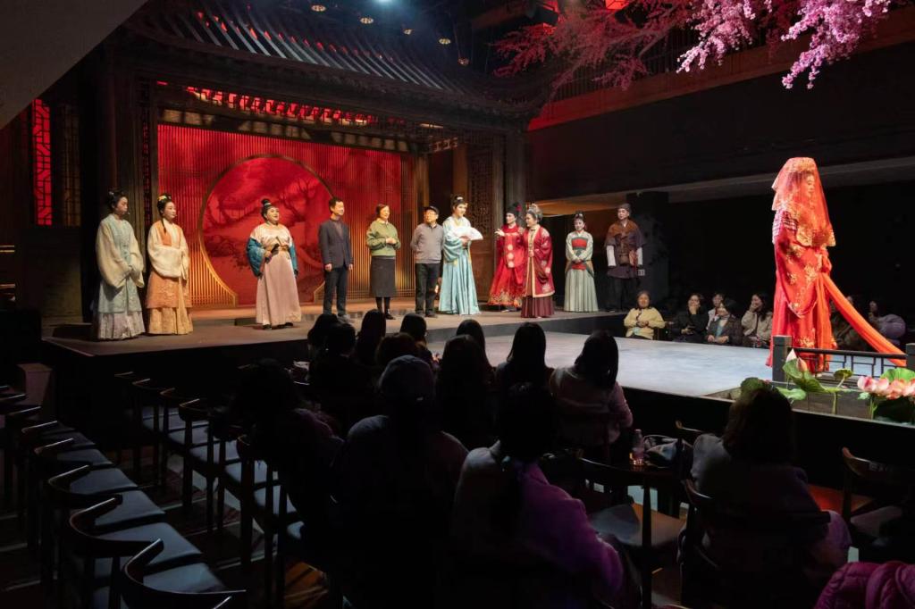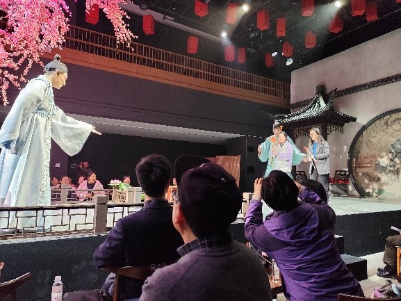 活动现场,音乐剧巧妙融合传统与现代元素,既有婉转典雅的唱腔,又不乏新颖灵动的编排,令观众耳目一新。演出过程中,演员多次走进观众席,与台下亲切互动,热情邀请女教师们一同打节拍、轻声跟唱。台上台下情感交融,掌声与歌声此起彼伏,气氛一次次被推向高潮。互动环节中,老师们纷纷举起手机记录精彩瞬间,或凝神欣赏,或会心一笑,现场欢声笑语不断。在悠扬旋律与热烈互动中,女教师们卸下平日忙碌,沉浸于艺术的雅韵之中,真切感受着传统文化的深厚底蕴与时代新声的交相辉映。
