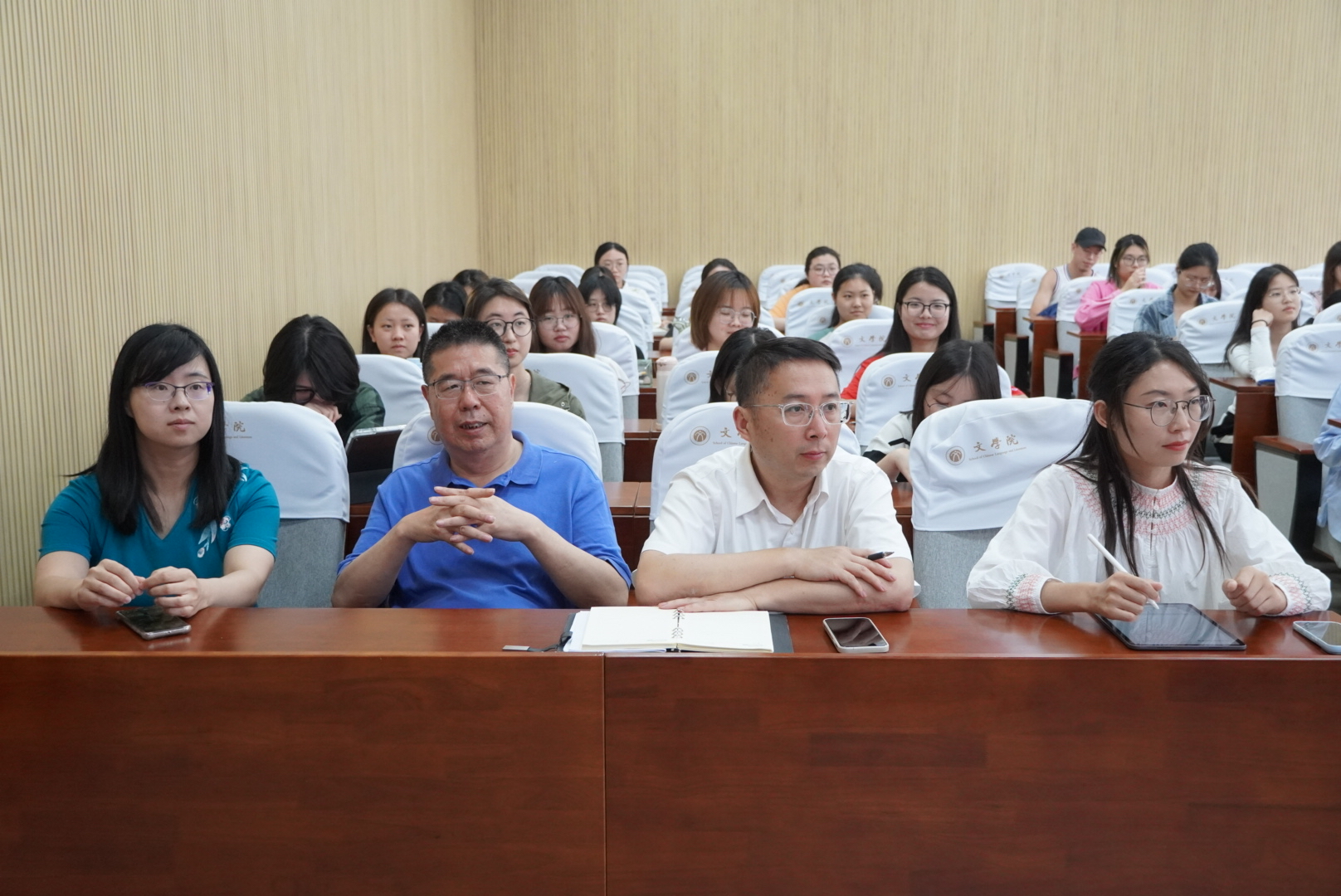 党委书记毛永宏、党委副书记兼副院长瞿晓庆、汉语言文学系鲍开恺老师、李香月老师、团委副书记张弛及2022级汉语专业学生参与了本次公开课。