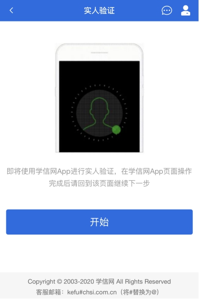 若考生从移动设备登录系统,则选择“学信网App”方式后,在移动设备页面点击【开始】,按照提示进行实人验证操作,完成后点击“返回主页”回到原操作的浏览器进行后续操作。