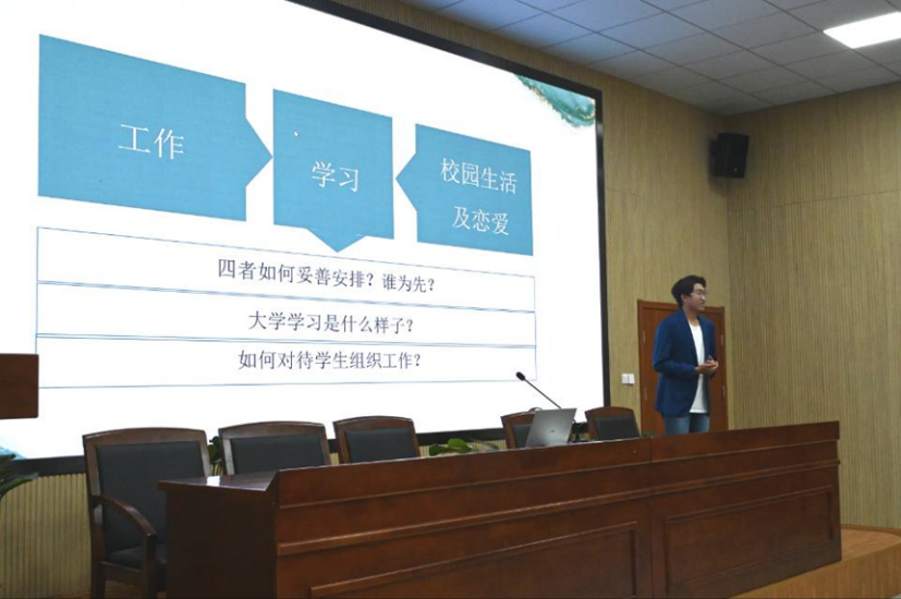学长学姐们依次上台,先以问题切入引发大家思考,再详细讲述了大学学习专业内容及方法经验,鼓励大家永怀一颗热爱生活的心,勇敢尝试各种挑战,细致负责做好工作,并在最后真诚祝福大家“成为一个清醒的行动者”。新生们认真聆听,积极互动,现场氛围活跃。