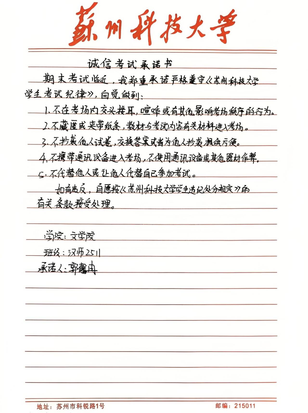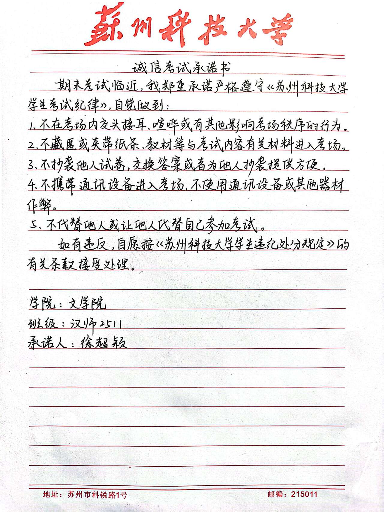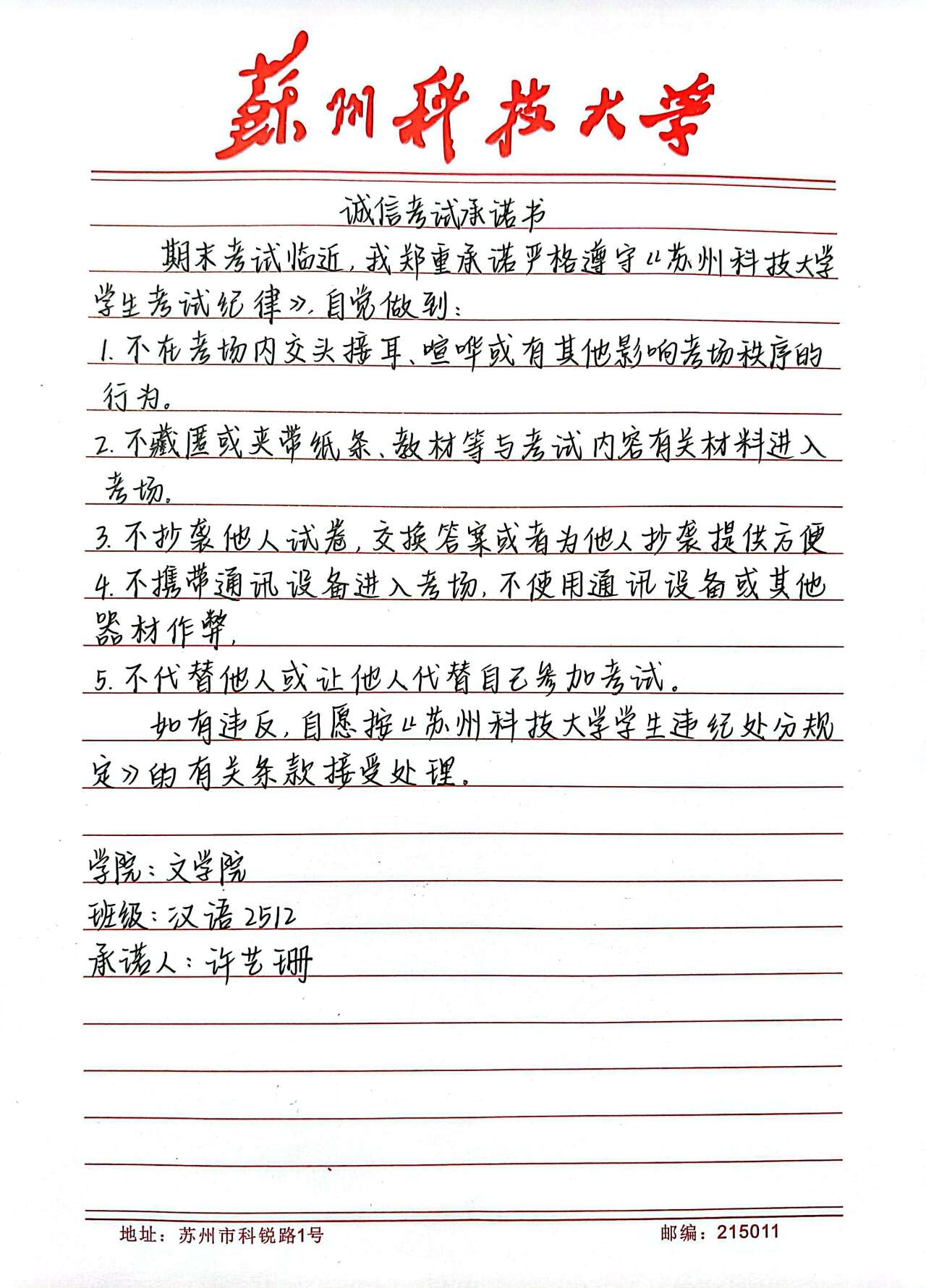 抄写《诚信考试承诺书》