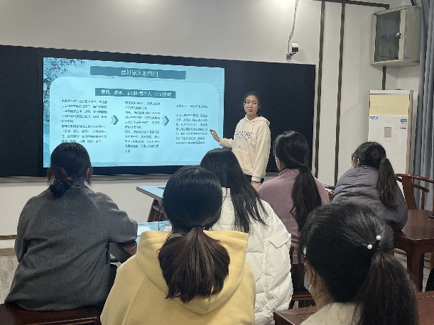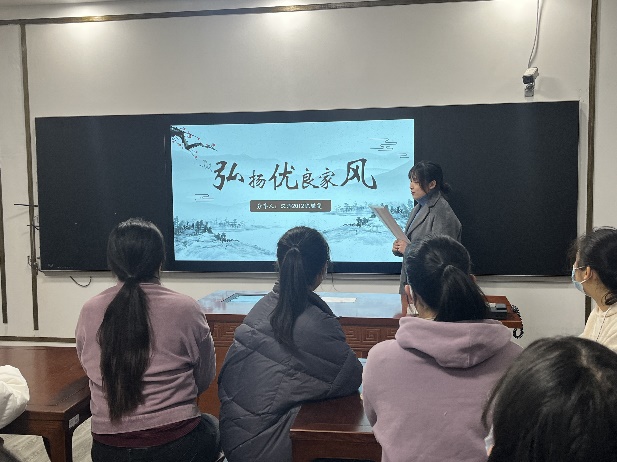 首先,三位同学各自分享了良好的家风家训。第一位同学重点介绍了《颜氏家训》的内涵、篇目等,列出四条家训供大家学习。第二位同学以“家书、家训、家风”展开讲述。第三位同学向大家介绍了良好家风的作用、好的家风家训、家风小故事以及新时代的家风,提出以醇美和谐的家风建设光明清正的国风。