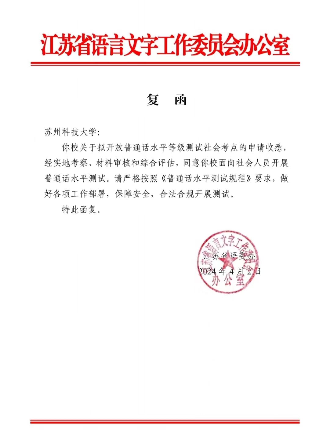 近日,由我校语委提出申请,经江苏省和苏州市语委办实地考察、材料审核和综合评估,我校普通话培训测试站获批面向社会人员开展普通话水平等级测试。